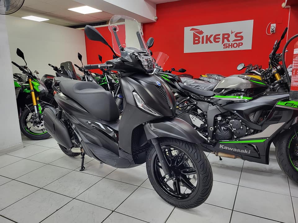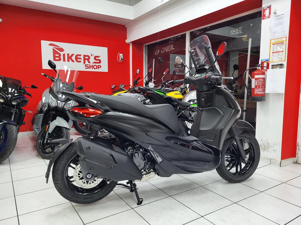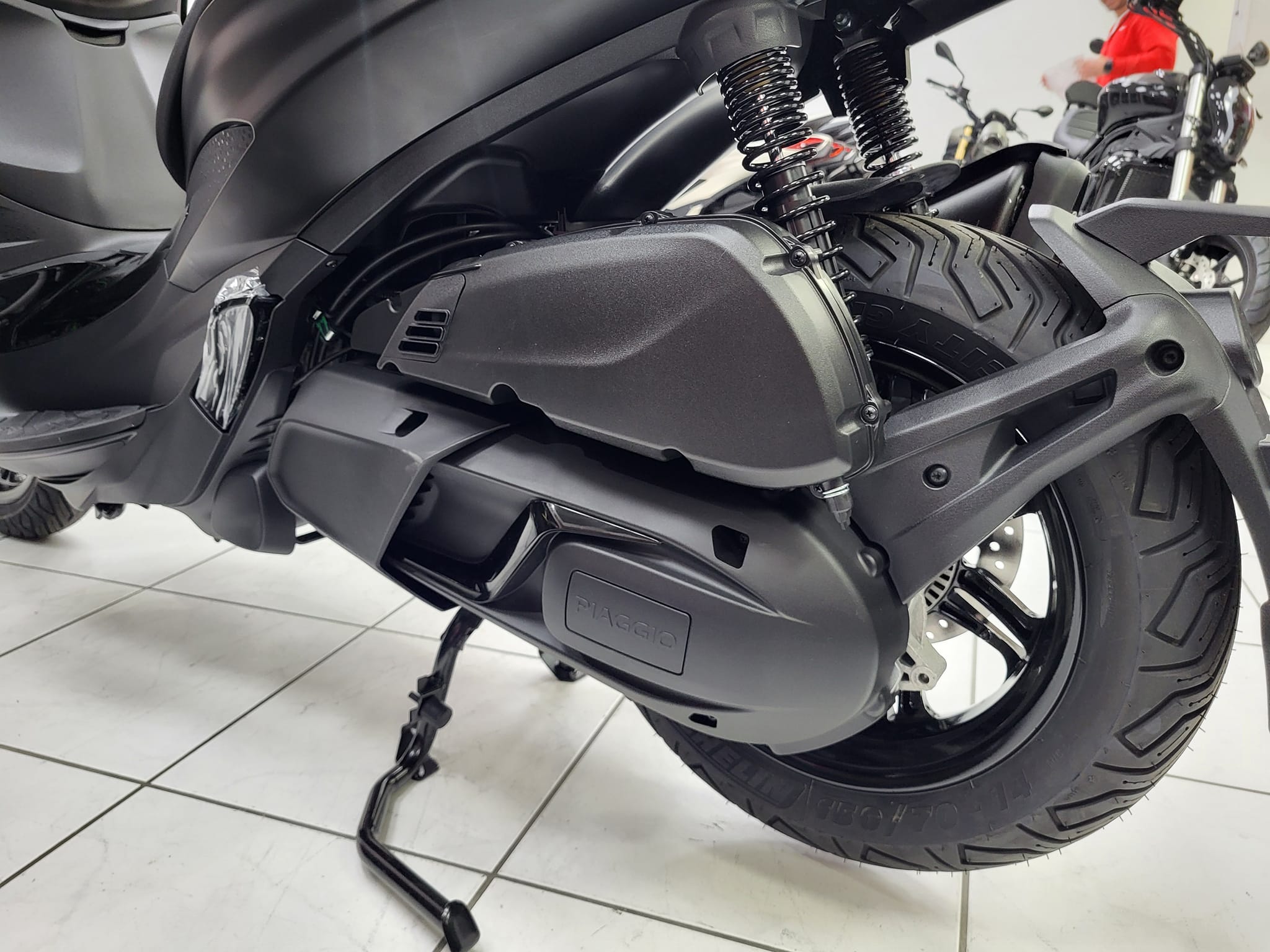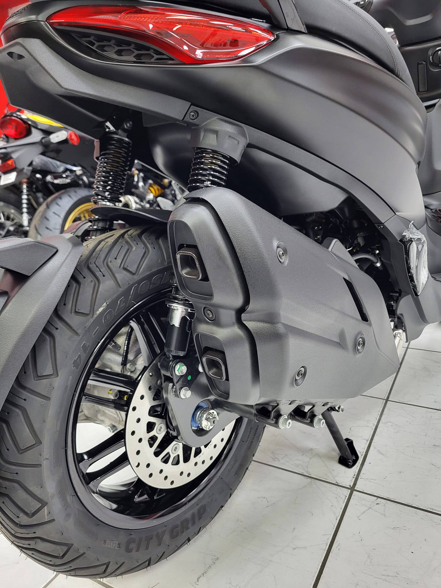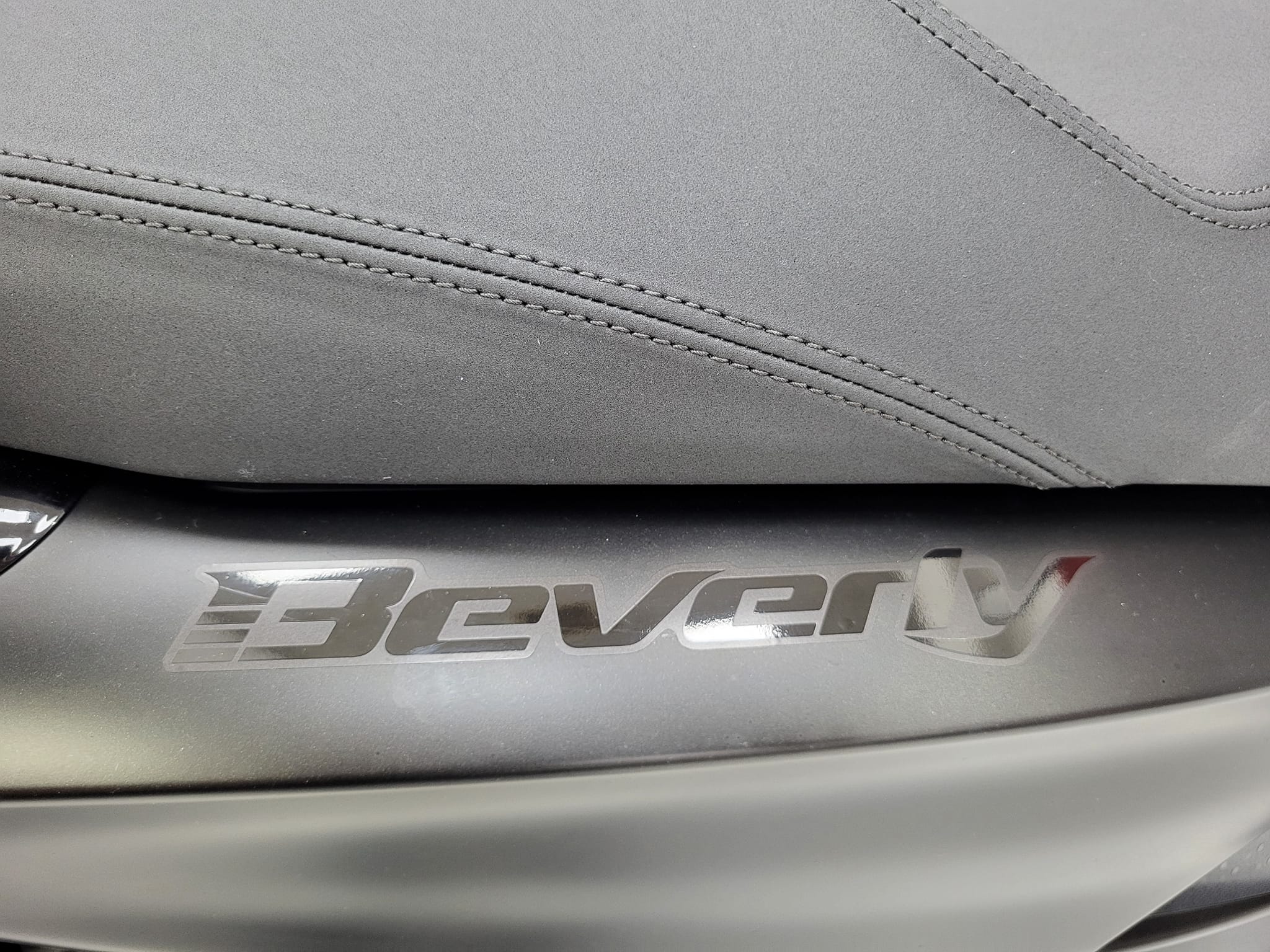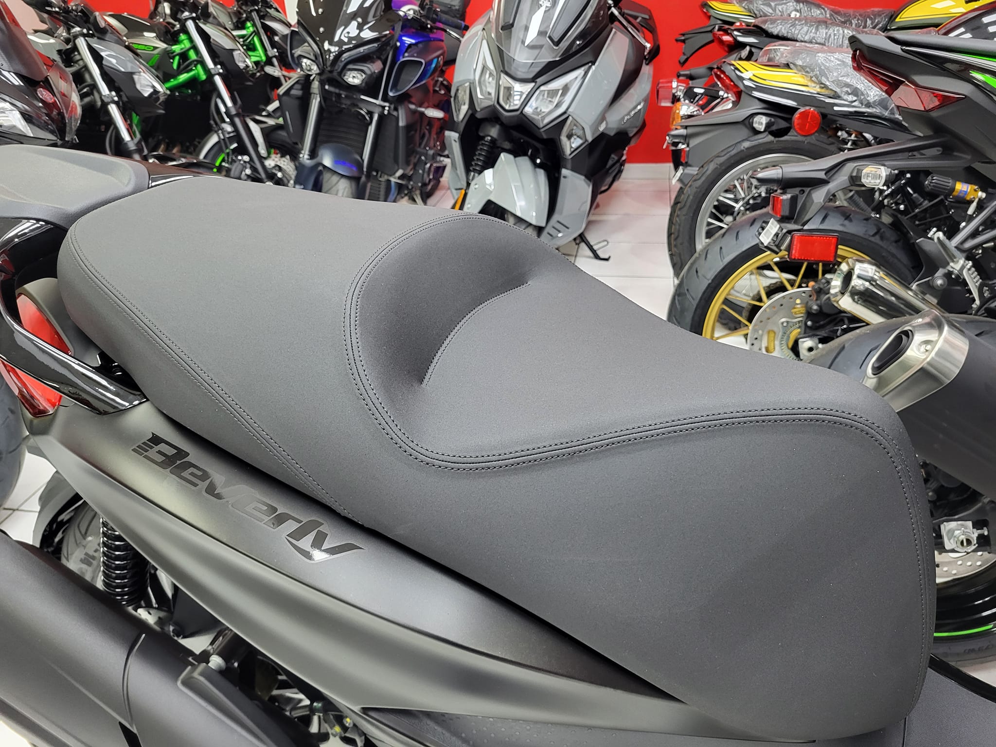 Το Piaggio Beverly S εντυπωσιάζει με τη σπορ ψυχή του: ματ φινίρισμα με εφέ γραφίτη διακρίνεται σε λεπτομέρειες όπως οι τροχοί, η πίσω χειρολαβή και τα πλαίσια του πίνακα οργάνων και του LED προβολέα, ενώ οι μπλε πινελιές στο λογότυπο «S», τον μπροστινό τροχό και την χαρακτηριστική μπροστινή γραβάτα τονίζουν τον επιθετικό χαρακτήρα. Το χαρακτηριστικό μπροστινό μέρος, με τον αεραγωγό σε σχήμα V και η κυψελοειδής γρίλια, μαζί με την κομψή ουρά και τις δίχρωμες ραφές της σέλας, ολοκληρώνουν τη σχεδίαση – δημιουργώντας τον τέλειο συνδυασμό ενός σπορ σκούτερ με μεγάλους τροχούς και ενός ισχυρού GT.