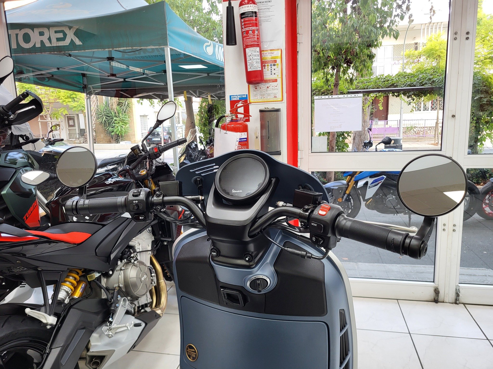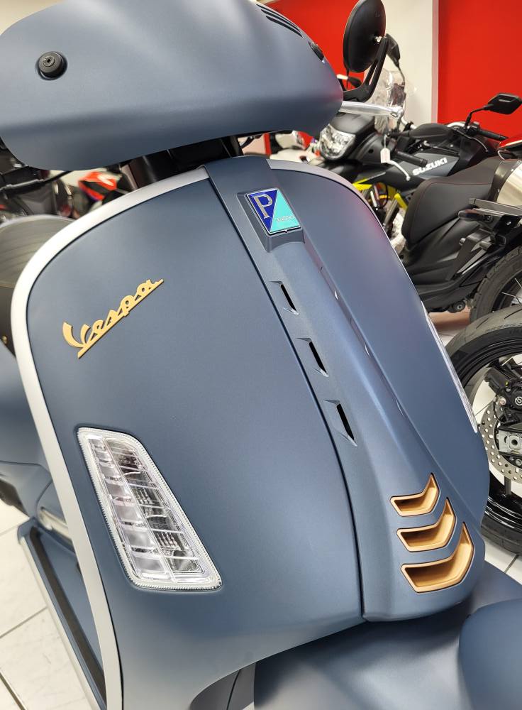Το μπλε είναι εμπνευσμένο από τα βιομηχανικά μηχανήματα του εργαστηρίου, με μεταλλικές λεπτομέρειες που αναδεικνύουν τη δυναμική σιλουέτα του σκούτερ.