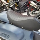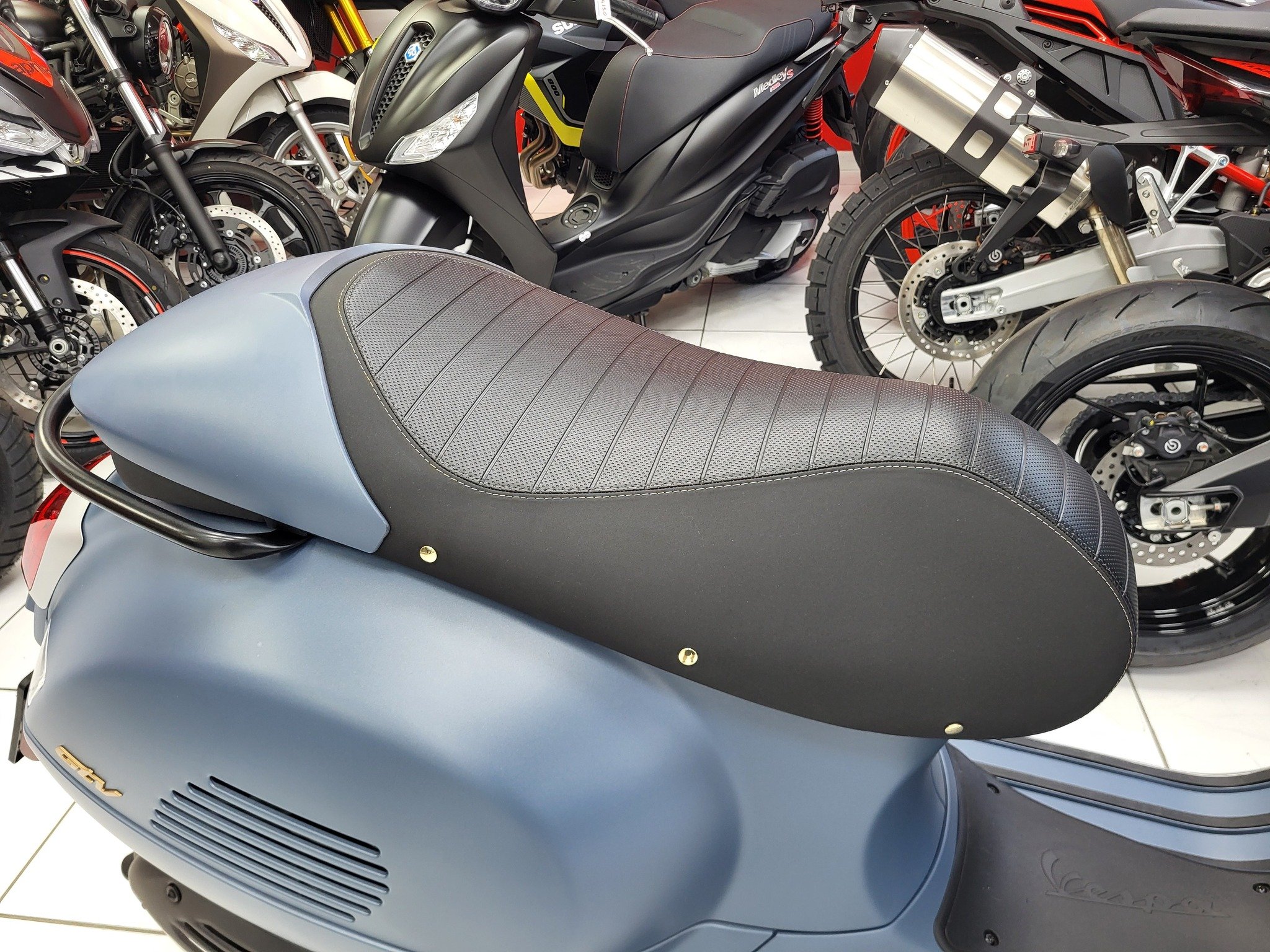 Η σέλα, με οριζόντια θερμομόνωση, γυαλισμένα χάλκινα πριτσίνια και ραφές σε αντίθεση, αποτελεί μια αναφορά στις αυθεντικές στολές εργασίας. Ο χαμηλός προβολέας, το γυμνό τιμόνι και η κλασική «γραβάτα» ολοκληρώνουν μια εμφάνιση που τιμά την κληρονομιά της Vespa μέσα από μια σειρά αυθεντικών λεπτομερειών.
